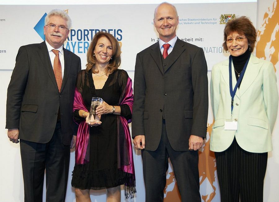 von links: Minister Zeil Sabine Fuchsberger-Paukert (Geschäftsführerin) Florian Picha (Inhaber und Geschäftsführer) Internationale Arzneimittel Ludwigs-Arzneimittel München GmbH & Co. KG Astrid Hartenstein (Laudatorin)