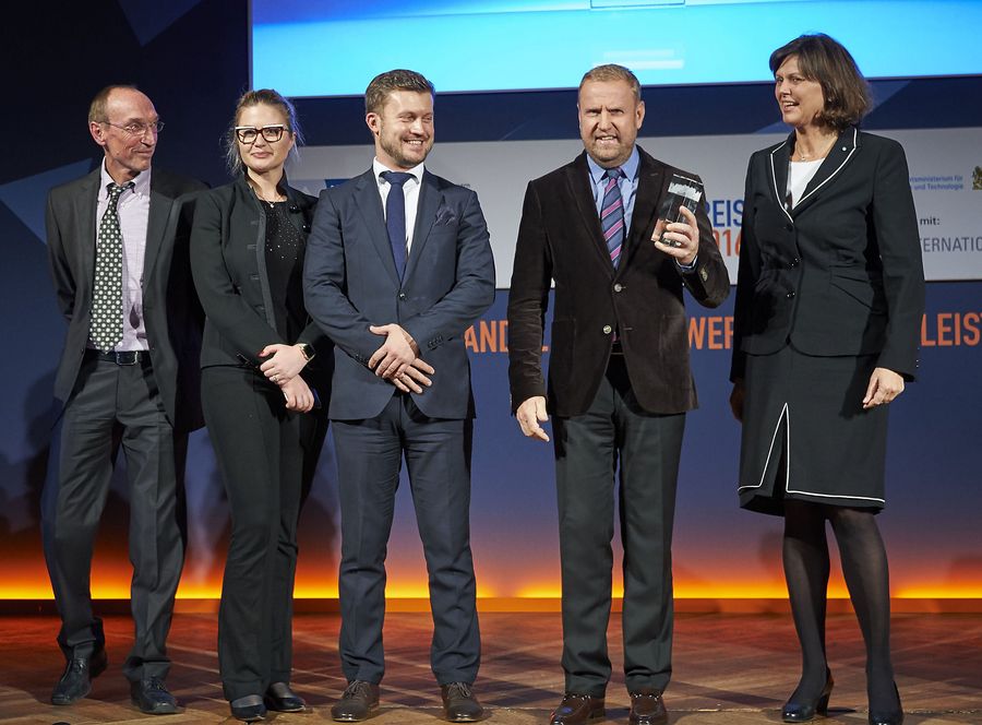 Von links nach rechts: Laudator Bernd Kullmann, Bojana Momcilovic (Prokuristin) und Sergey Altynbaev (Chief Engineer), Alexej Rasskazov (Inhaber und Geschäftsführer), Staatsministerin Ilse Aigner