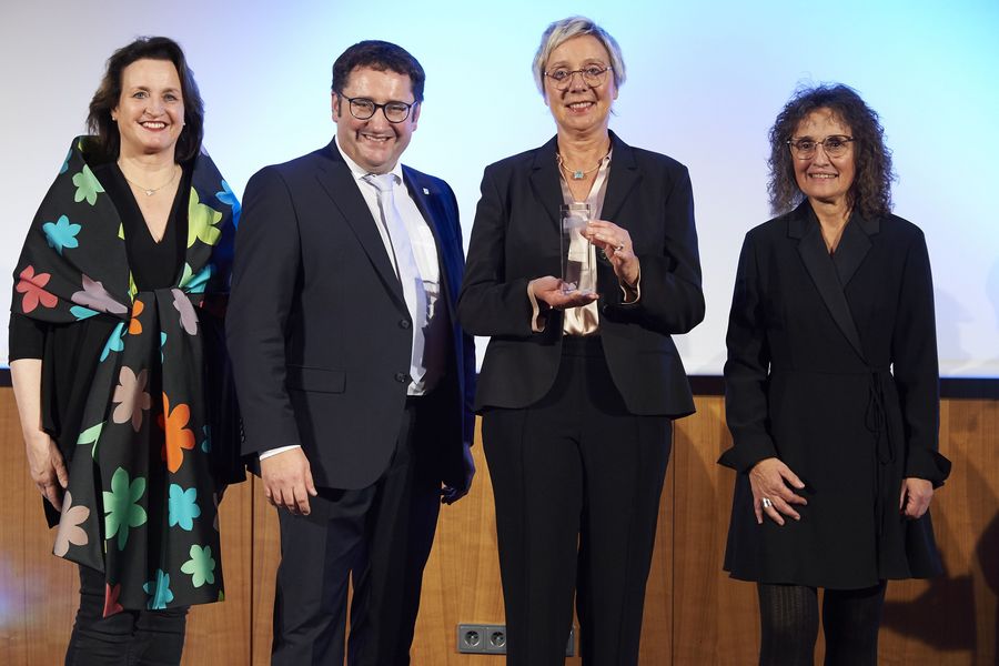 Laudatorin Andrea Wirsching (Weingut Hans Wirsching KG), Staatssekretär Tobias Gotthardt, Frau Anne Feulner (Inhaberin und Geschäftsführerin) und Frau Martina Dütsch-Cerbone (Exportleitung)